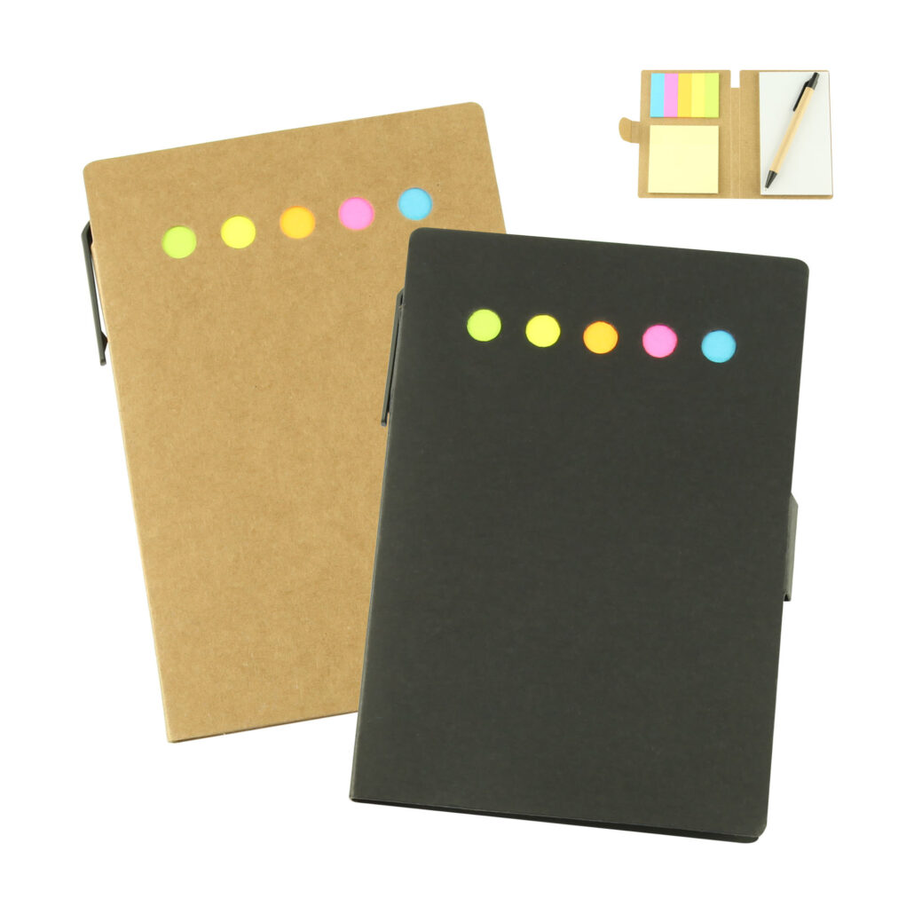 多功能記事本,包含 50 頁記事本、25 頁粘性記事本、五種不同顏色的粘性紙旗墊(藍色、粉色、橙色、黃色、綠色),以及一支可滑動的回收紙板桶筆進入筆記本的書脊。未漂白的天然紙板蓋,帶安全閉合。對於辦公室職員和學生來說非常方便的筆記本。