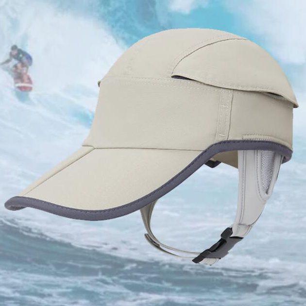 在海裡可將側邊扣帶扣上,下水時不需擔心帽子沖走,在陸地上可將側邊扣帶折進帽體。